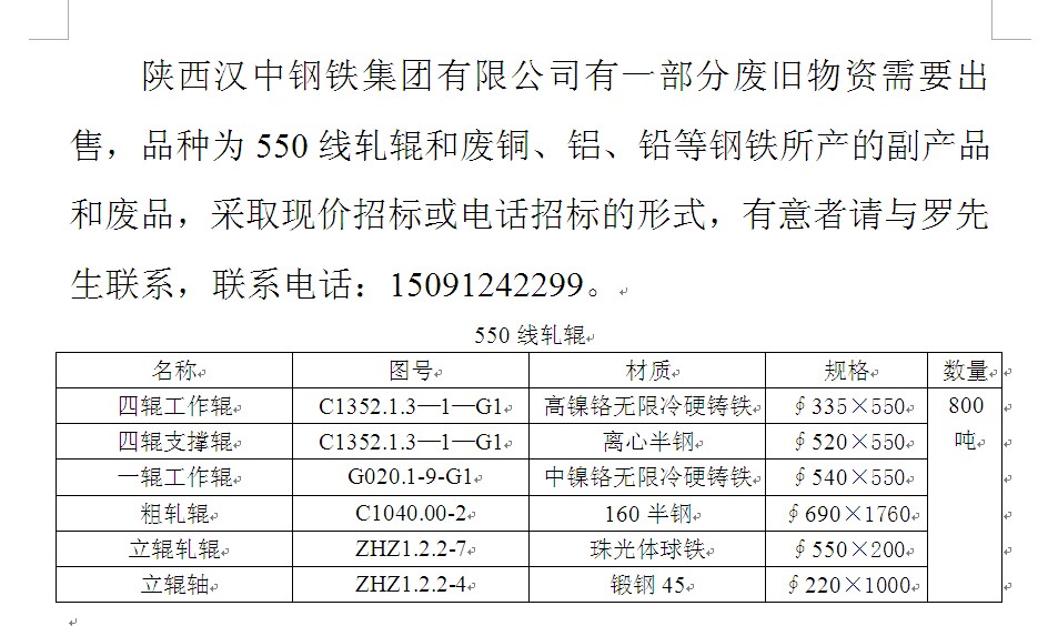 陜西漢中鋼鐵集團有限公司有一部分廢舊物資需要出售