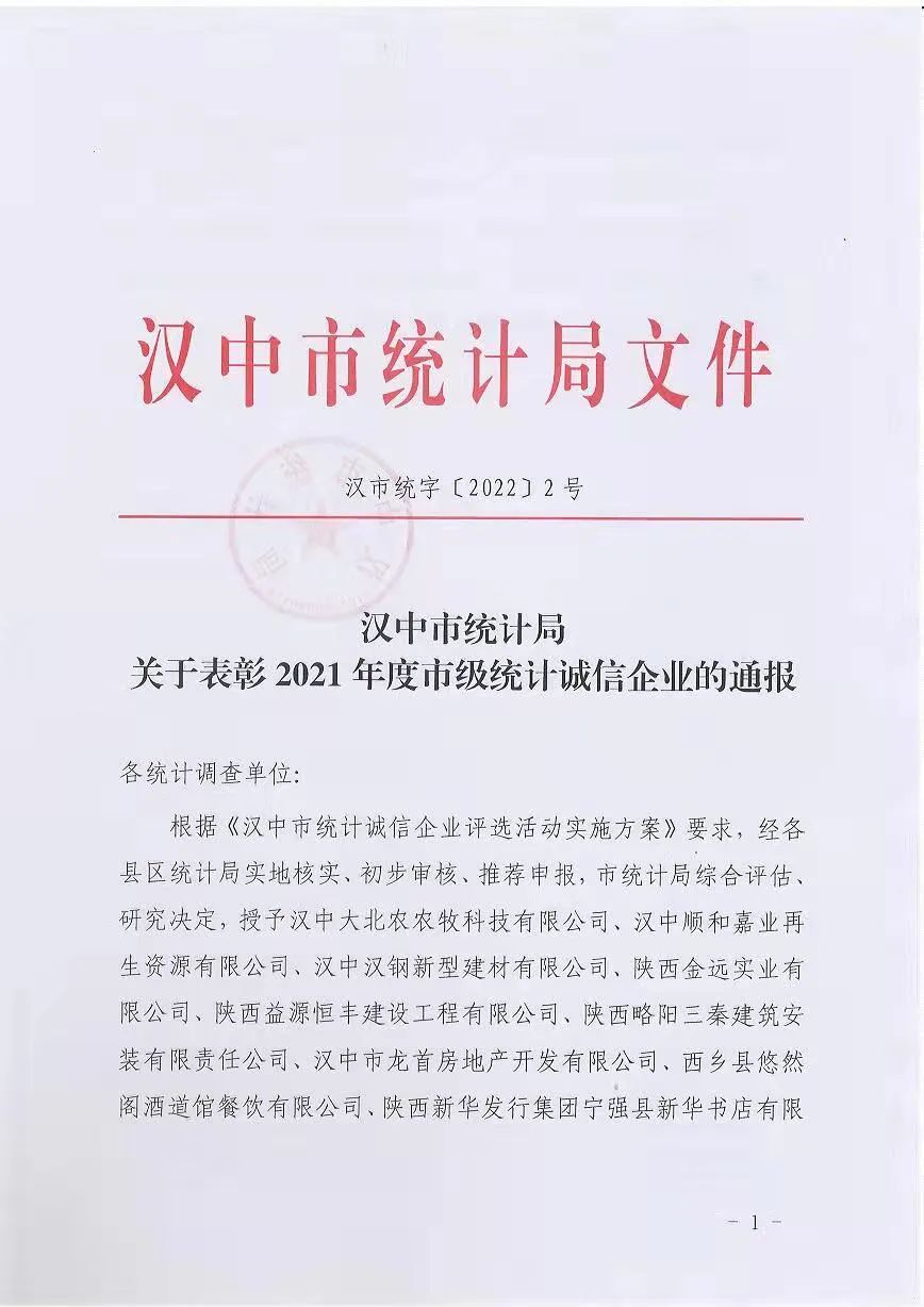 漢中順和嘉業(yè)再生資源有限公司被評為2021年度 “漢中市統(tǒng)計誠信企業(yè)”